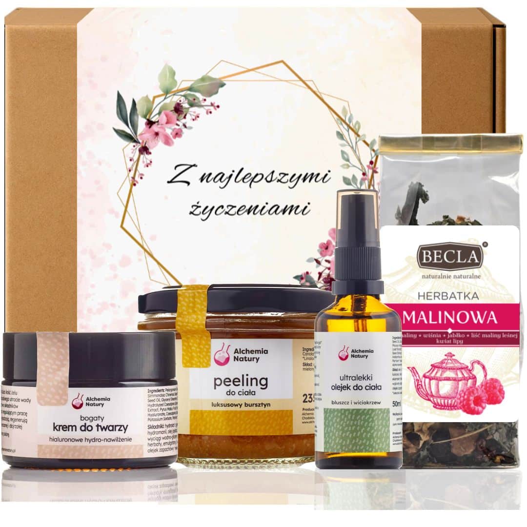 Zestaw ręcznie wykonanych kosmetyków naturalnych z podkarpackiej manufaktury kosmetyków naturalnych Alchemia Natury w zestawie z czekoladą, herbatą lub dżemem dereniowym do wyboru.